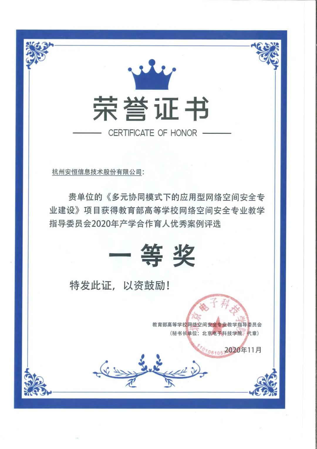 2020年11月24日,获教育部高等学校网络空间安全专业教学指导委员会2020年产学合作育人优秀案例评选一等奖。