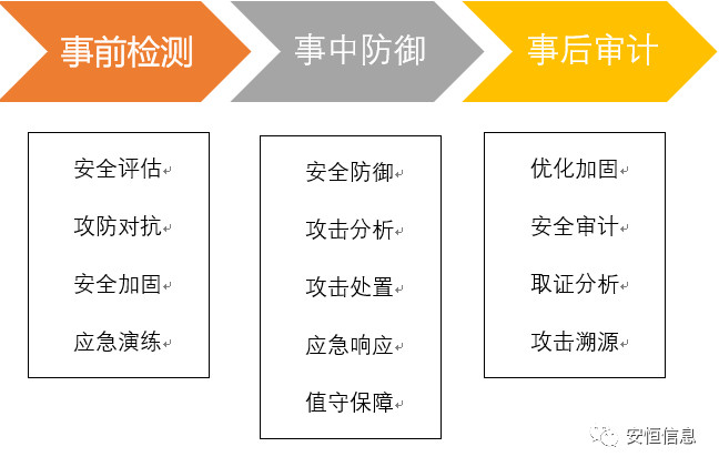 数十年大型会议、活动网络安保工作,让安恒信息安服团队总结形成“重设计、摸底数、掌态势、分轻重、勤演练、重值守、深防护、构闭环、人为本、共协同”的网络安保全体系化解决方案,即安保工作可以按照阶段推进工作,明确各阶段工作重点,围绕“事前检测、事中防御、事后审计”的网络安全解决方案策略,开展各项及专项网络安全工作。